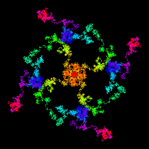 A defining feature of fractals is complex self-similarity at different scales. For the Martin attractor, this is evident as one watches what happens while it grows as points are added. It starts out as a small square or diamond, then puts out four “tentacles,” fills in to become a square or diamond again, then puts out four more tentacles to repeat the process. (Like an alien life form taking over a planet.) And significantly, you can’t tell by looking at it how large it has grown; the overall structure is similar at all scales.